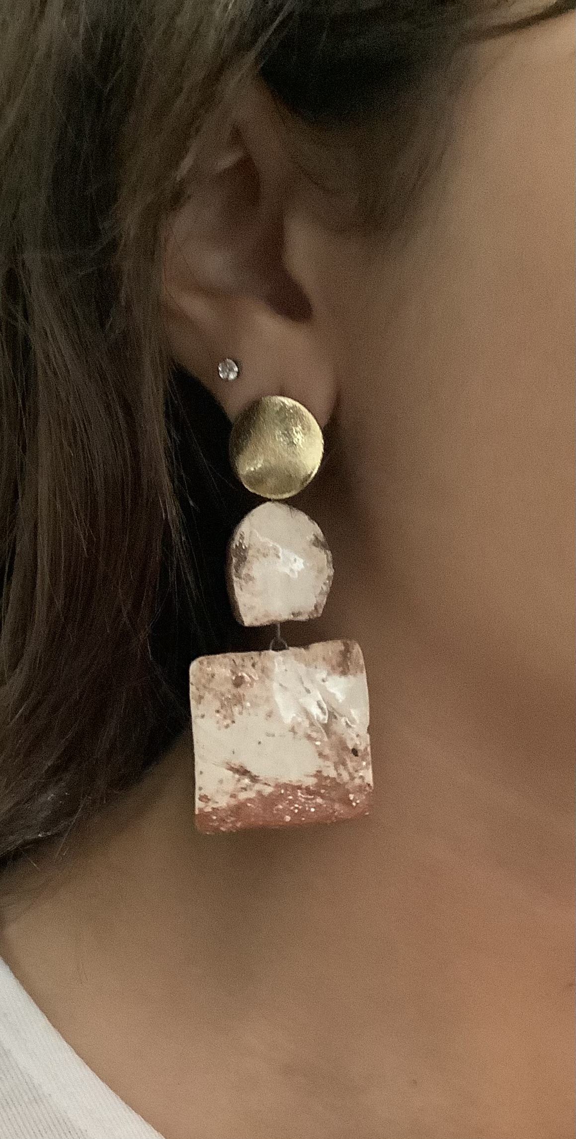 Ces boucles d’oreilles pendantes associent la beauté brute dela faïence aux reflets élégants du laiton doré. Façonnées à la main en terres mêlées, elles révèlent un mélange unique de nuances naturelles — blanc cassé, ocres et bruns — mis en valeur par un disque martelé en laiton.