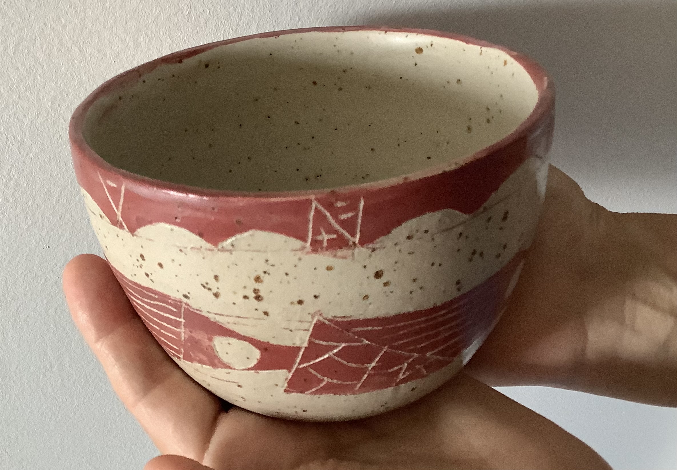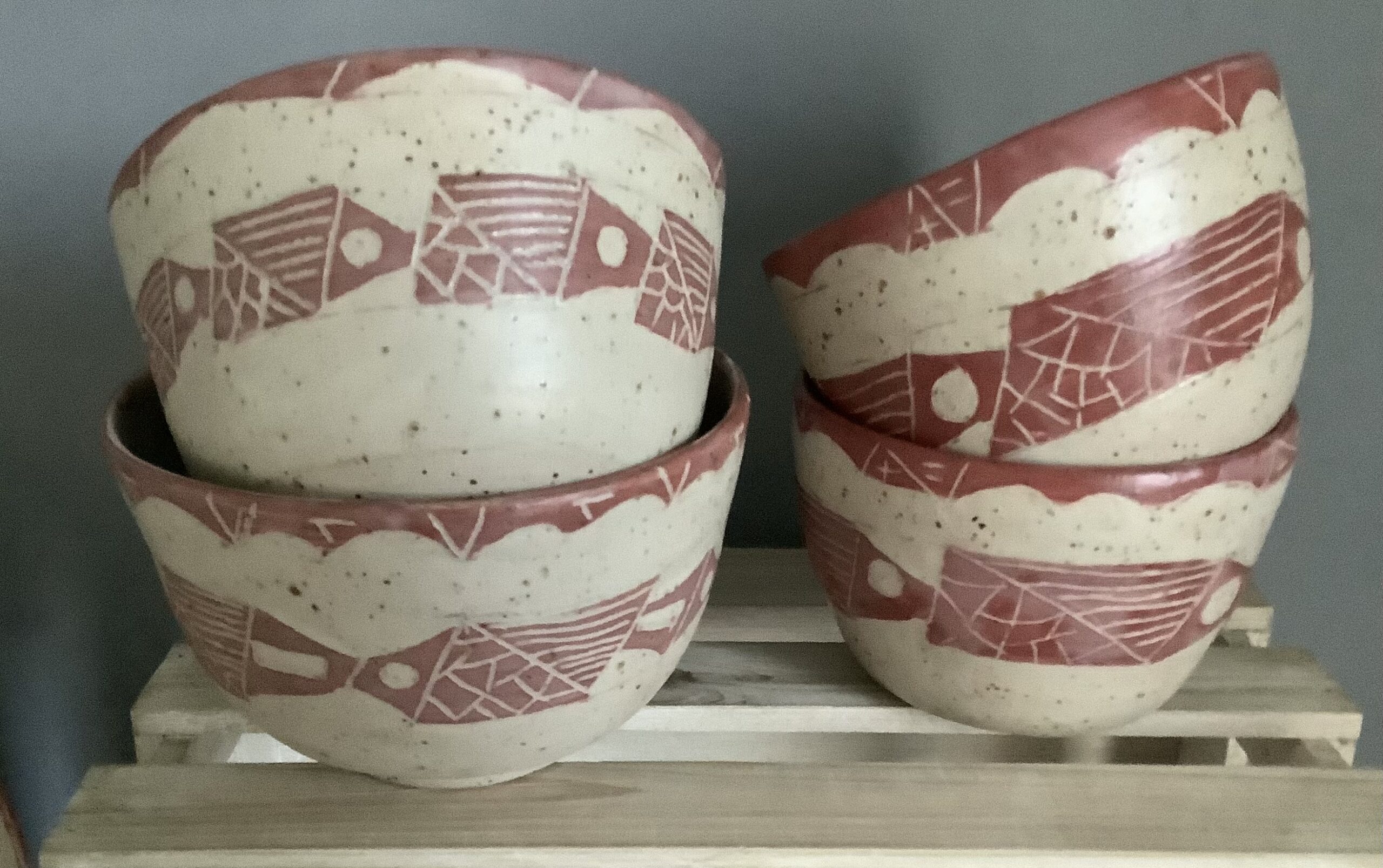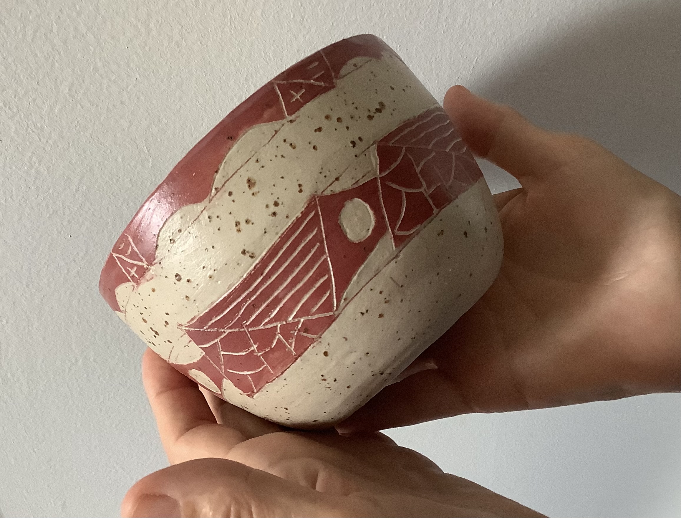 Chaque pièce est tournée à la main, puis décorée par la technique du sgrafitto dans l’engobe rouge, révélant la couleur naturelle de la terre.