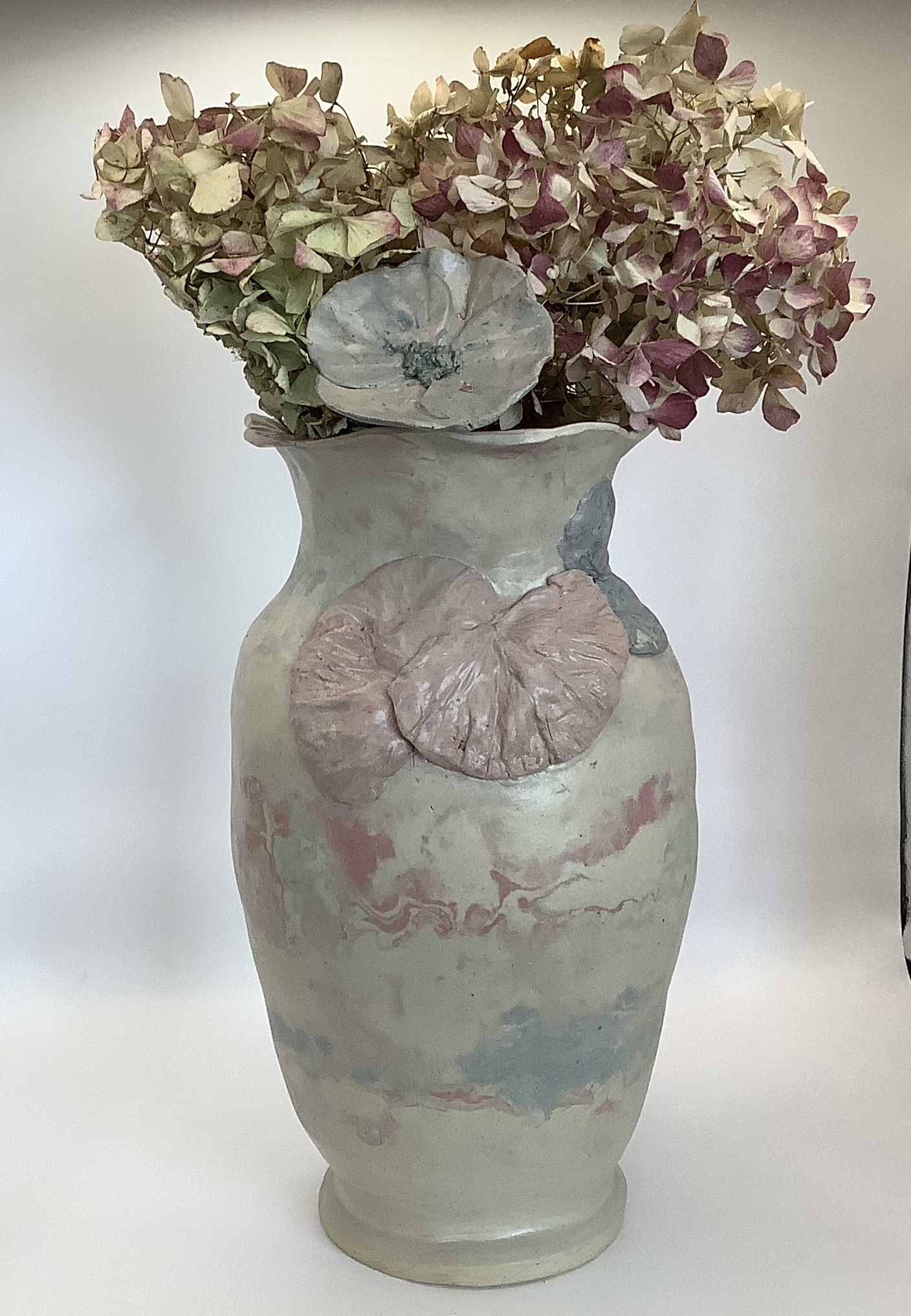 Handcrafted stoneware vase, coloured throughout and decorated with hand-sculpted flowers.