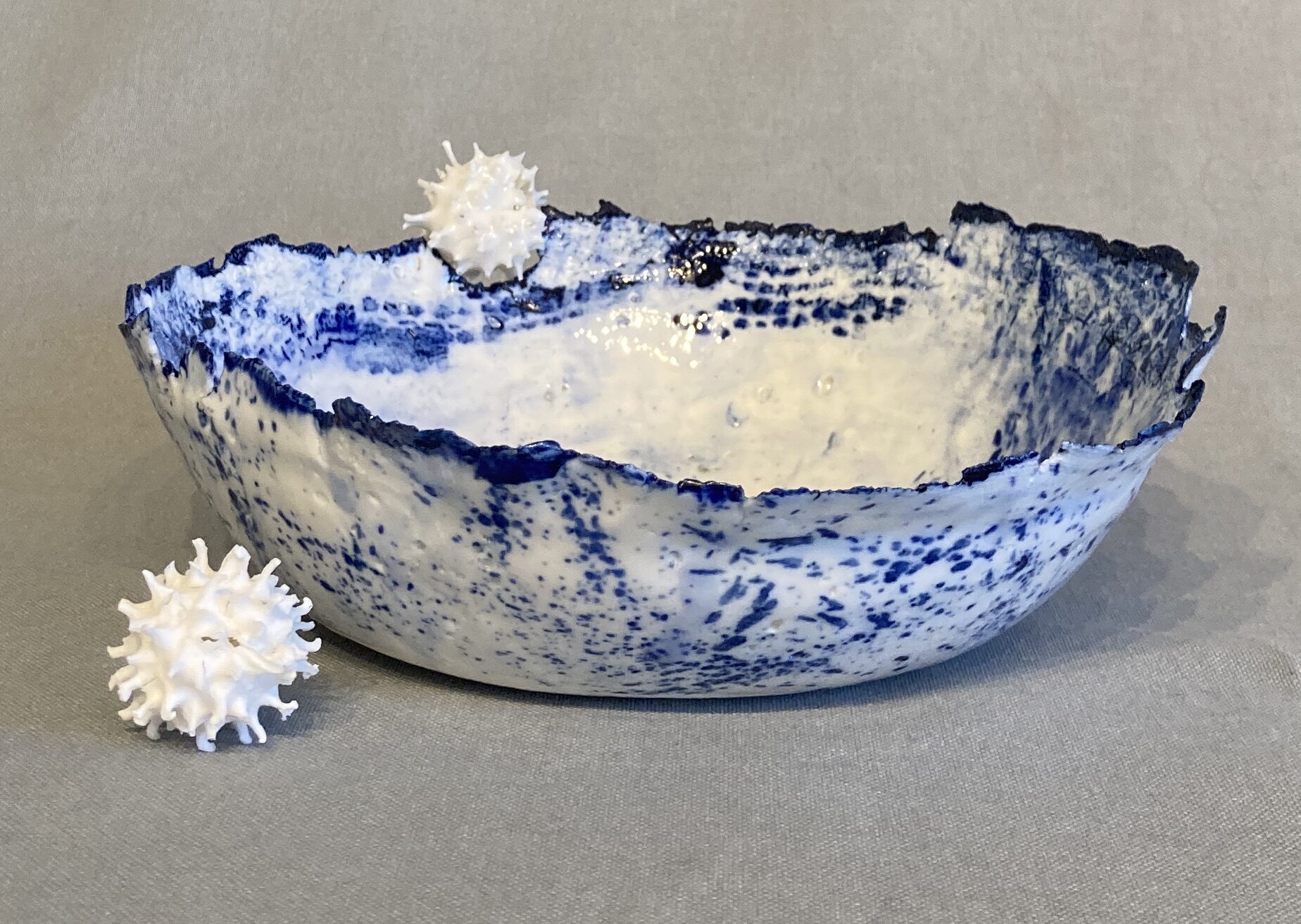 Copa de porcelana con decoración de semillas de plátano y esmalte azul.
